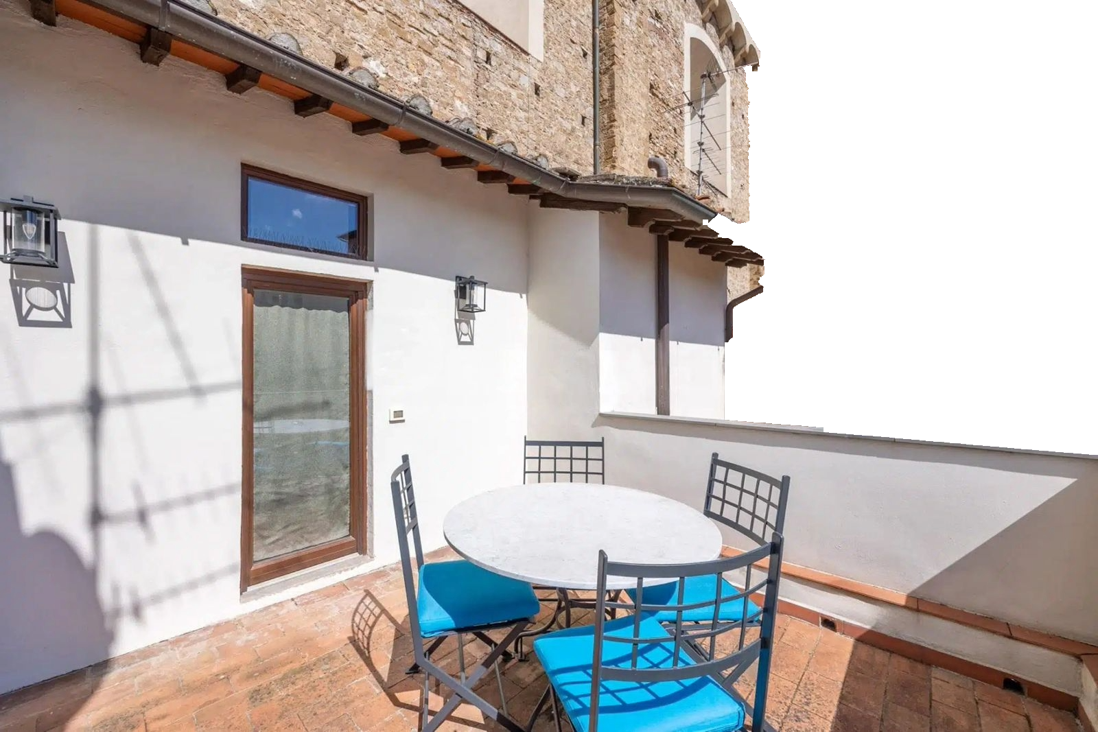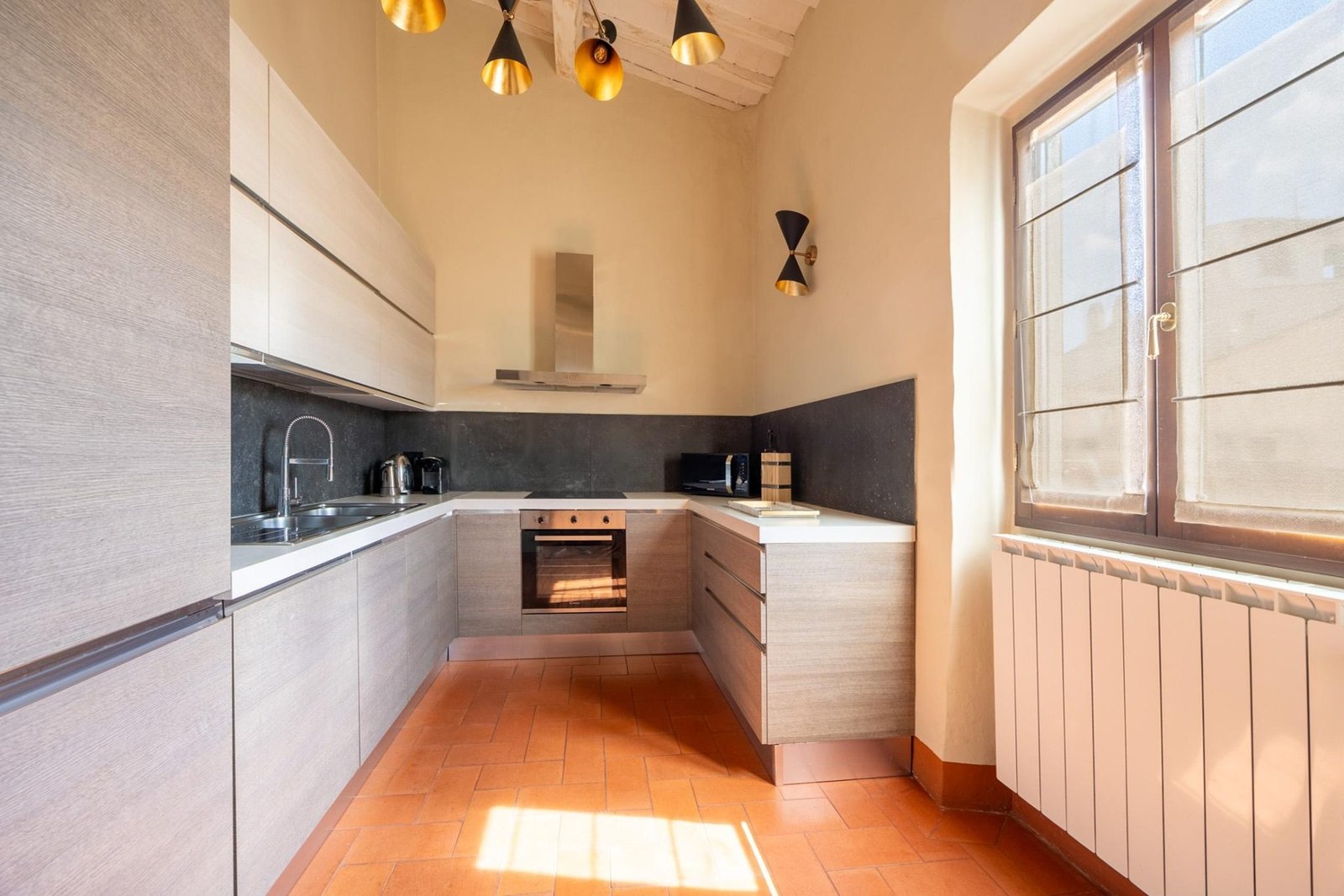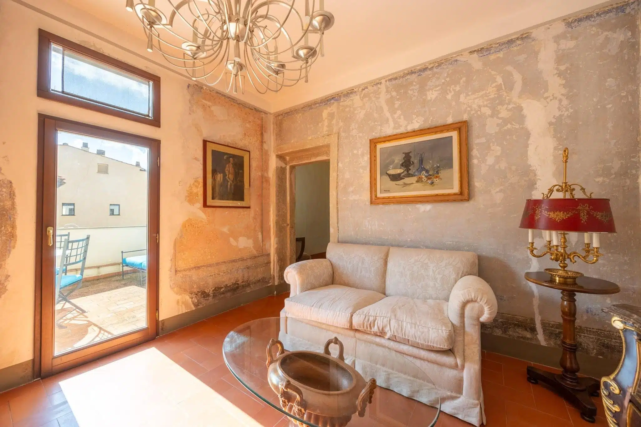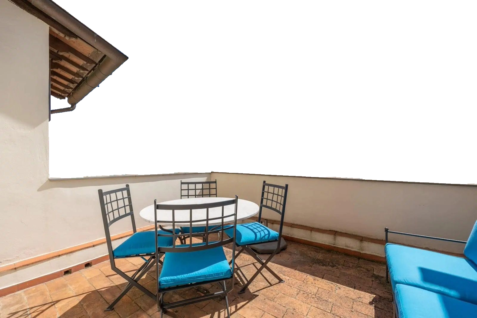 L’ingresso apre su un elegante soggiorno decorato con affreschi originali della fine del XVI secolo, che conduce direttamente alla terrazza affacciata su Piazza del Carmine e sulla celebre chiesa di Santa Maria del Carmine, famosa per la Cappella Brancacci. La zona giorno comprende inoltre una spaziosa cucina completamente attrezzata e una luminosa sala da pranzo.