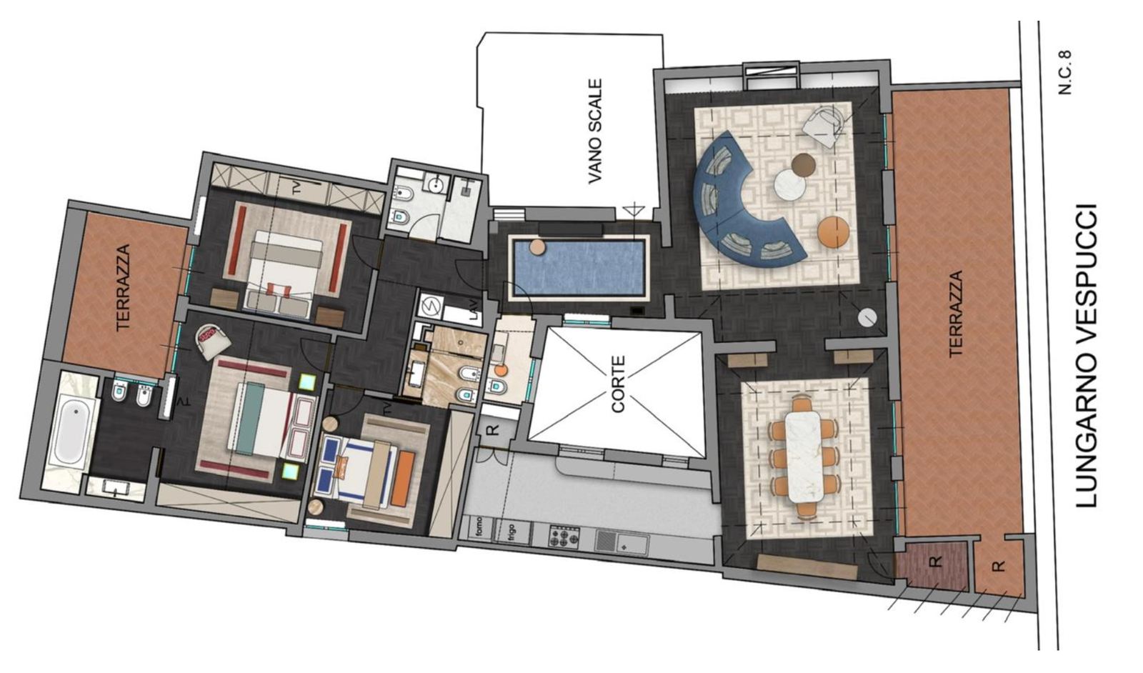 Ogni dettaglio, dai materiali pregiati al design su misura, riflette la cura e la passione tipiche dello stile fiorentino più autentico. Il servizio di portierato e l’ascensore garantiscono sicurezza e comfort quotidiano, completando un’esperienza abitativa di assoluto livello.