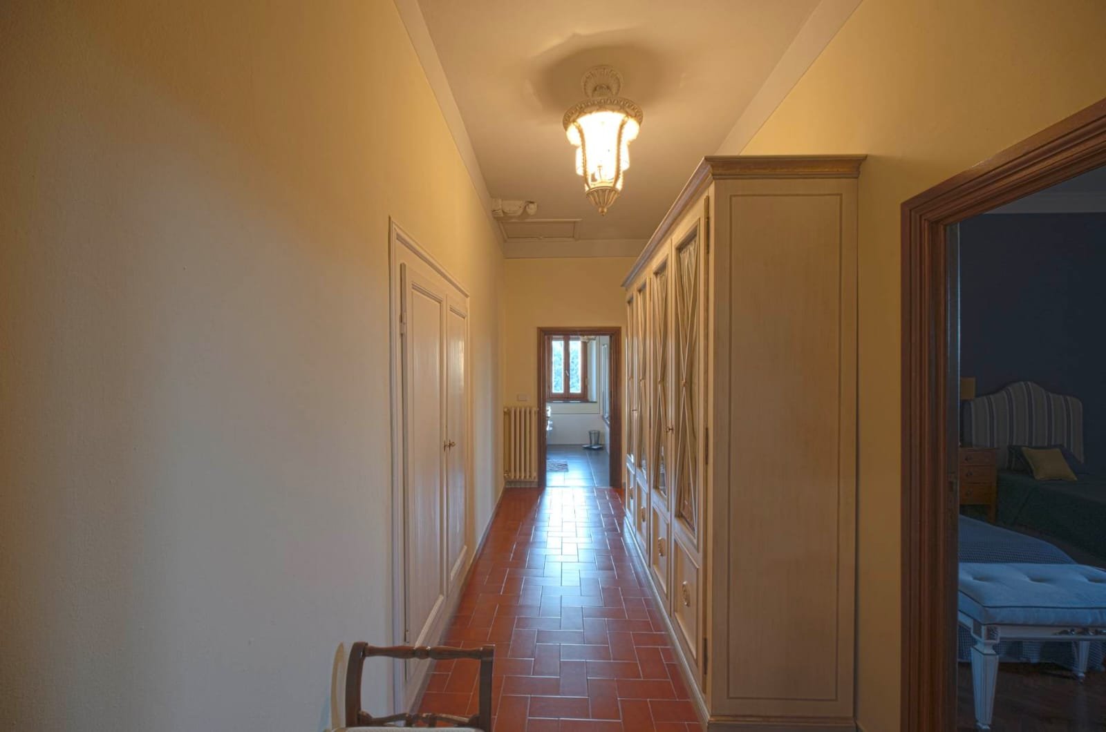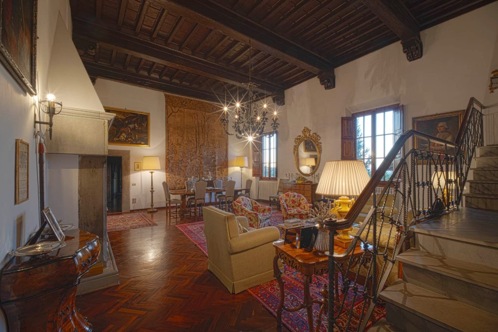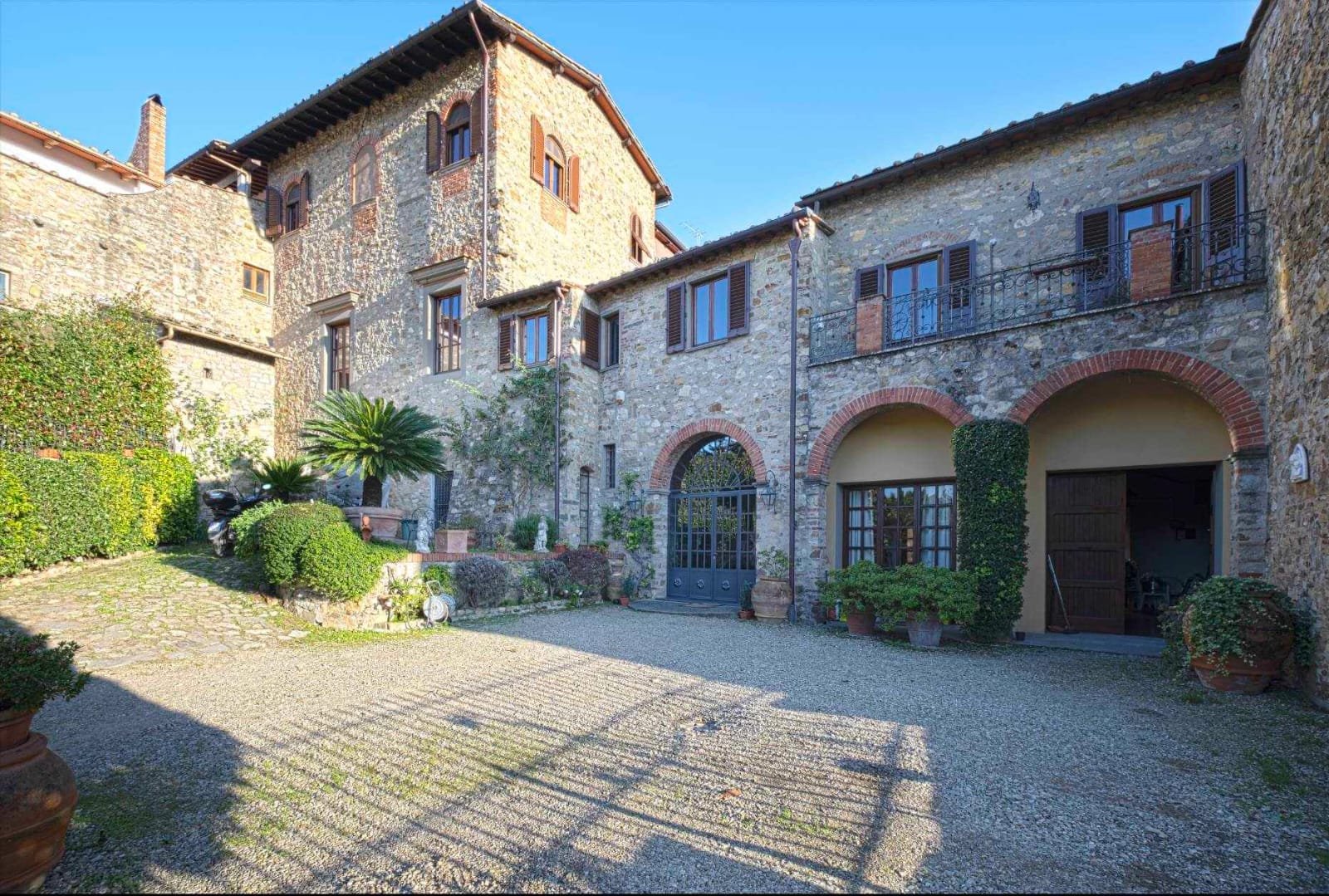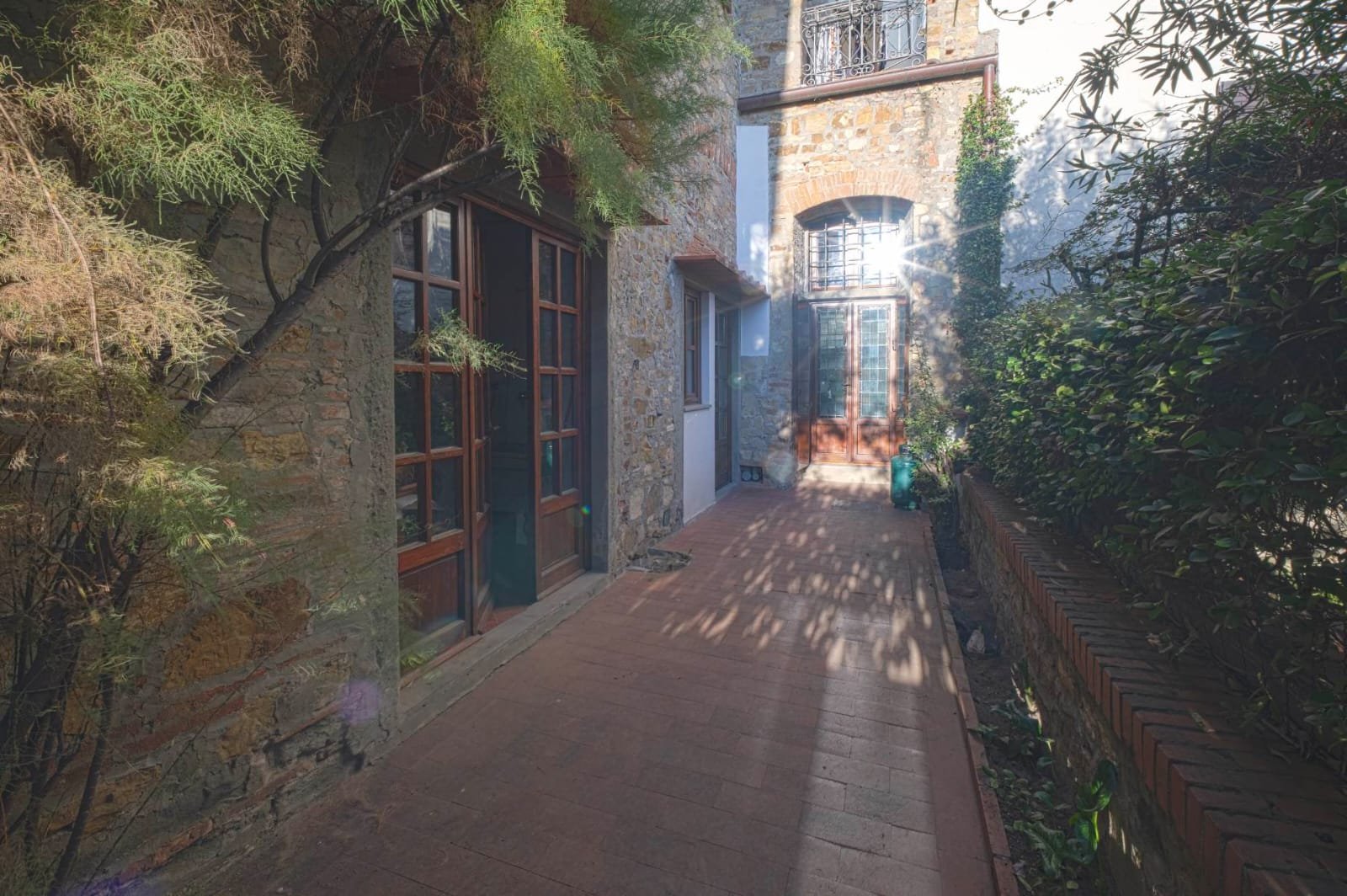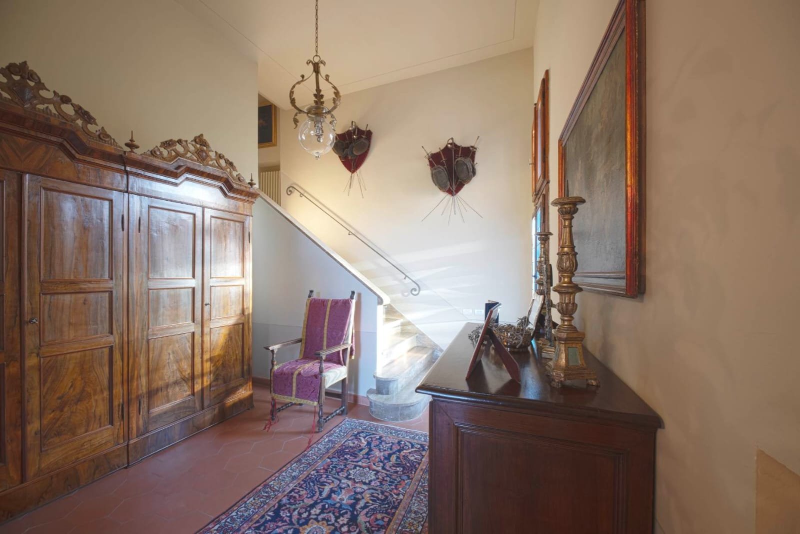 Gli interni conservano i materiali autentici: soffitti con travi a vista e cassettoni, pavimenti in cotto e dettagli in pietra serena. Le ampie camere e le zone giorno si aprono su balconi panoramici, mentre la doppia esposizione garantisce luce naturale in ogni ambiente.