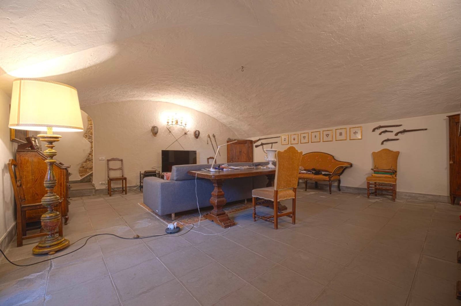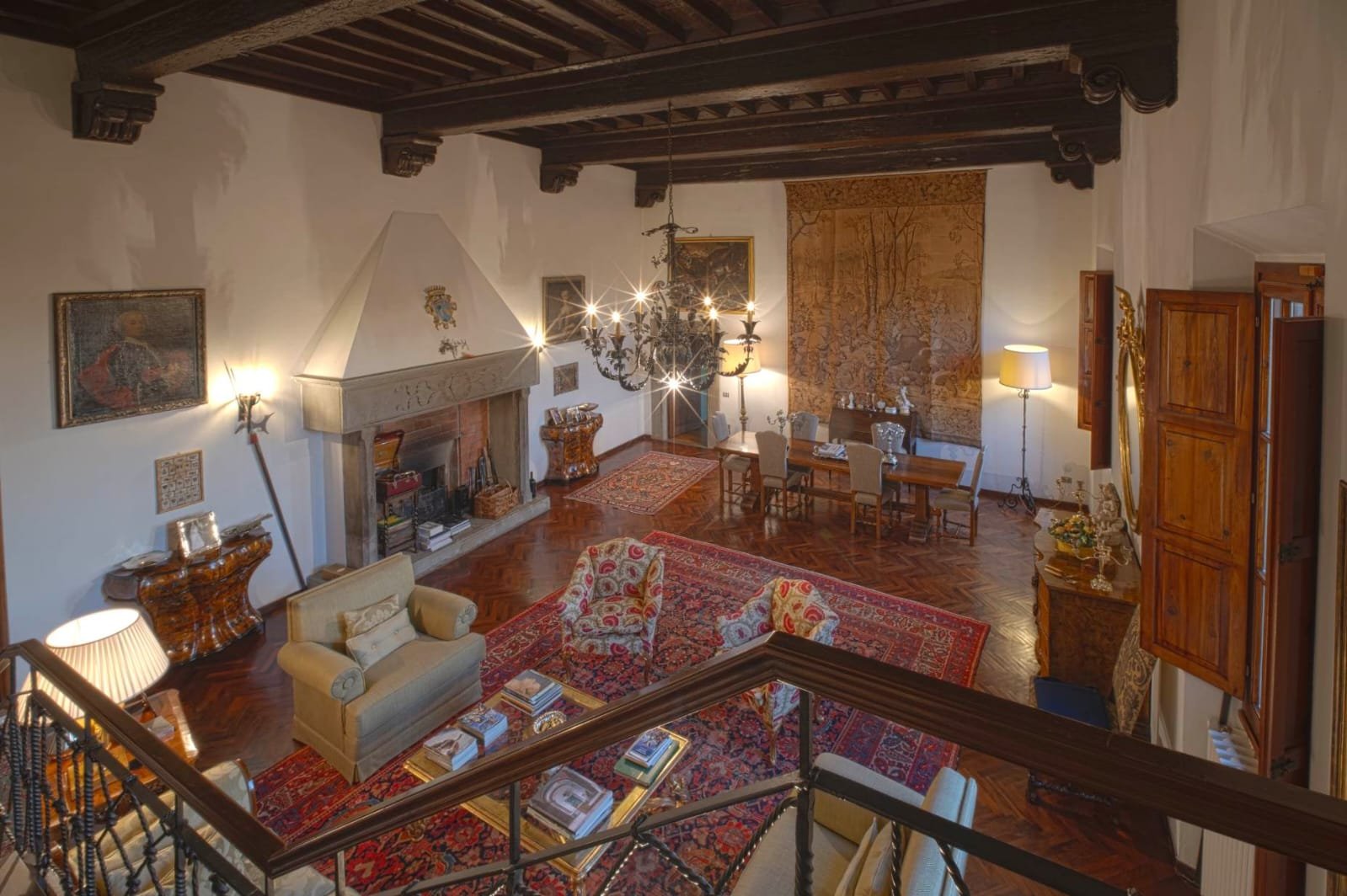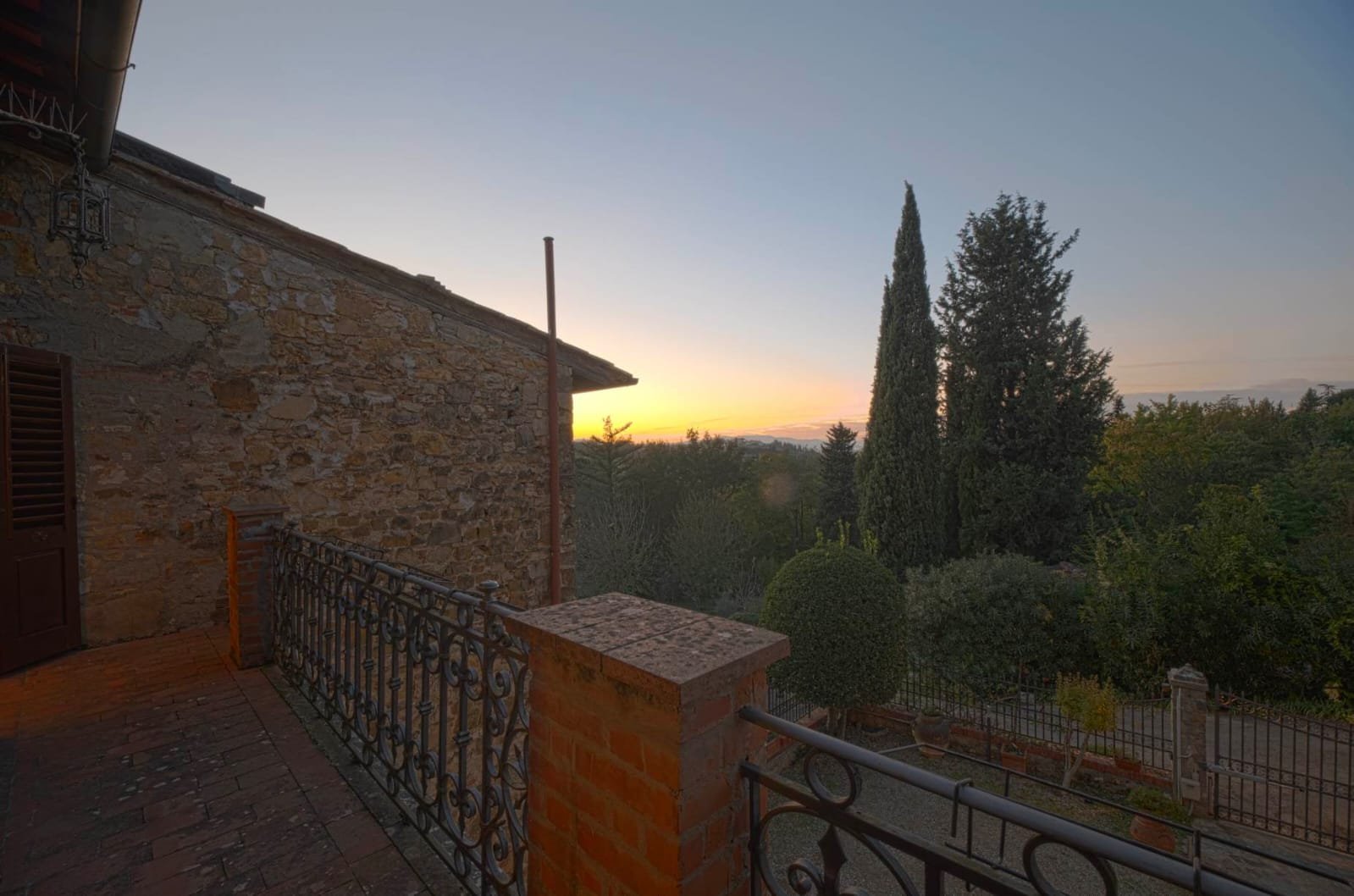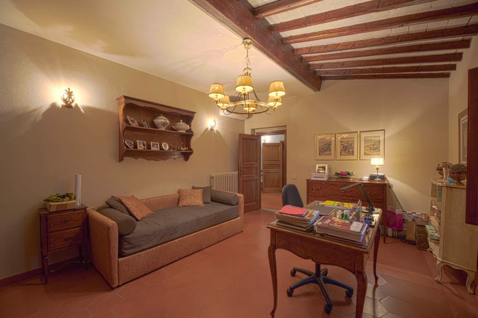 Gli interni conservano i materiali autentici: soffitti con travi a vista e cassettoni, pavimenti in cotto e dettagli in pietra serena. Le ampie camere e le zone giorno si aprono su balconi panoramici, mentre la doppia esposizione garantisce luce naturale in ogni ambiente.