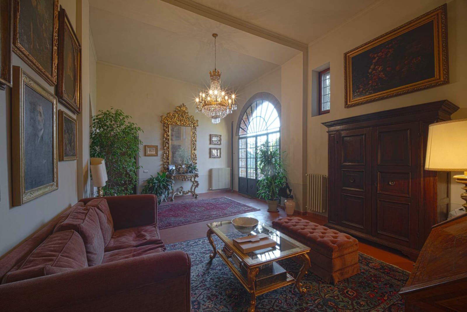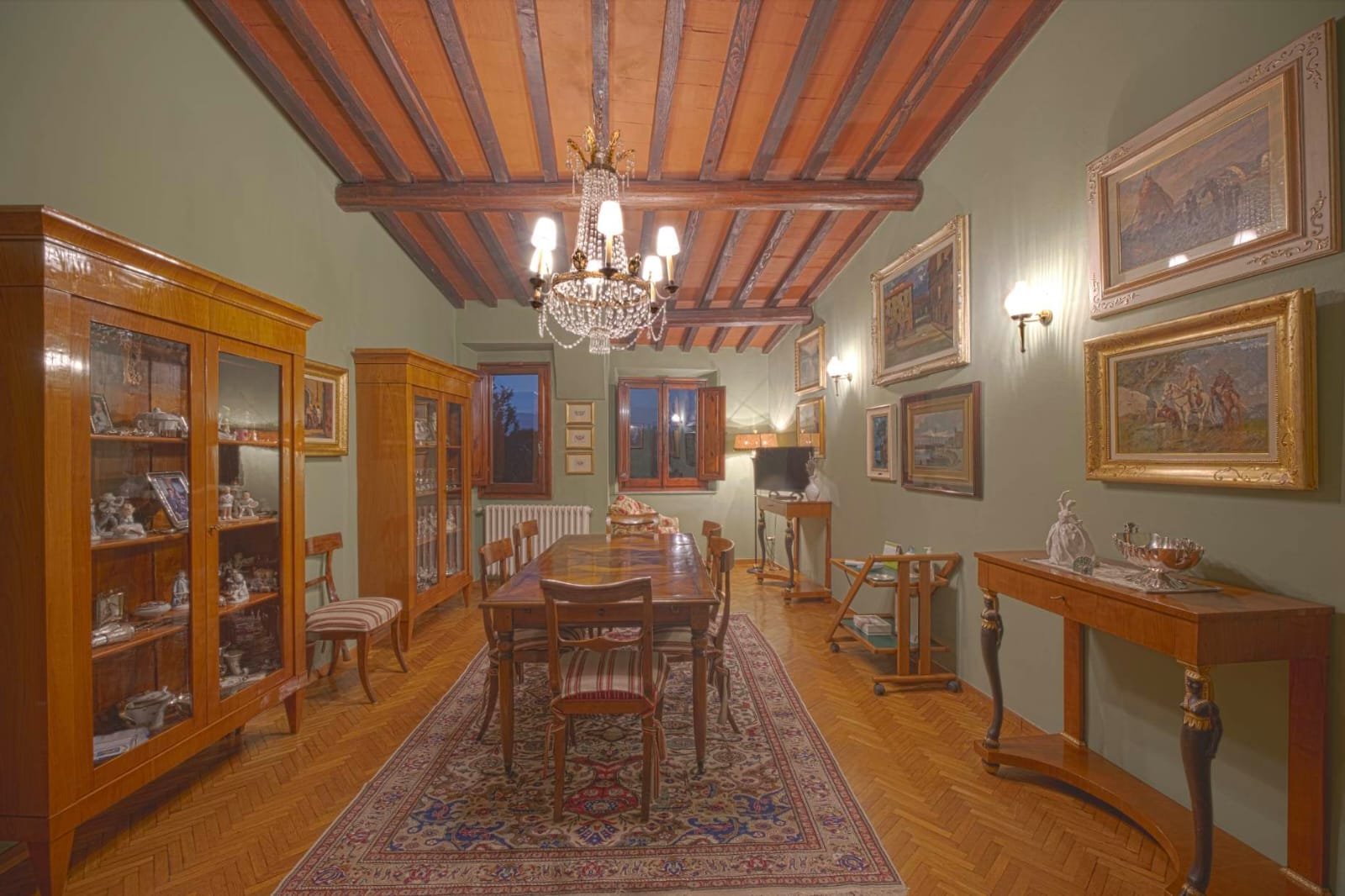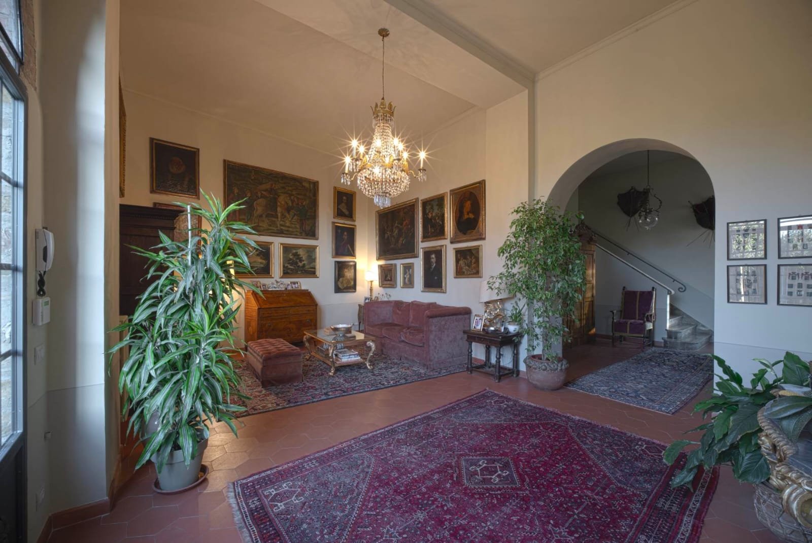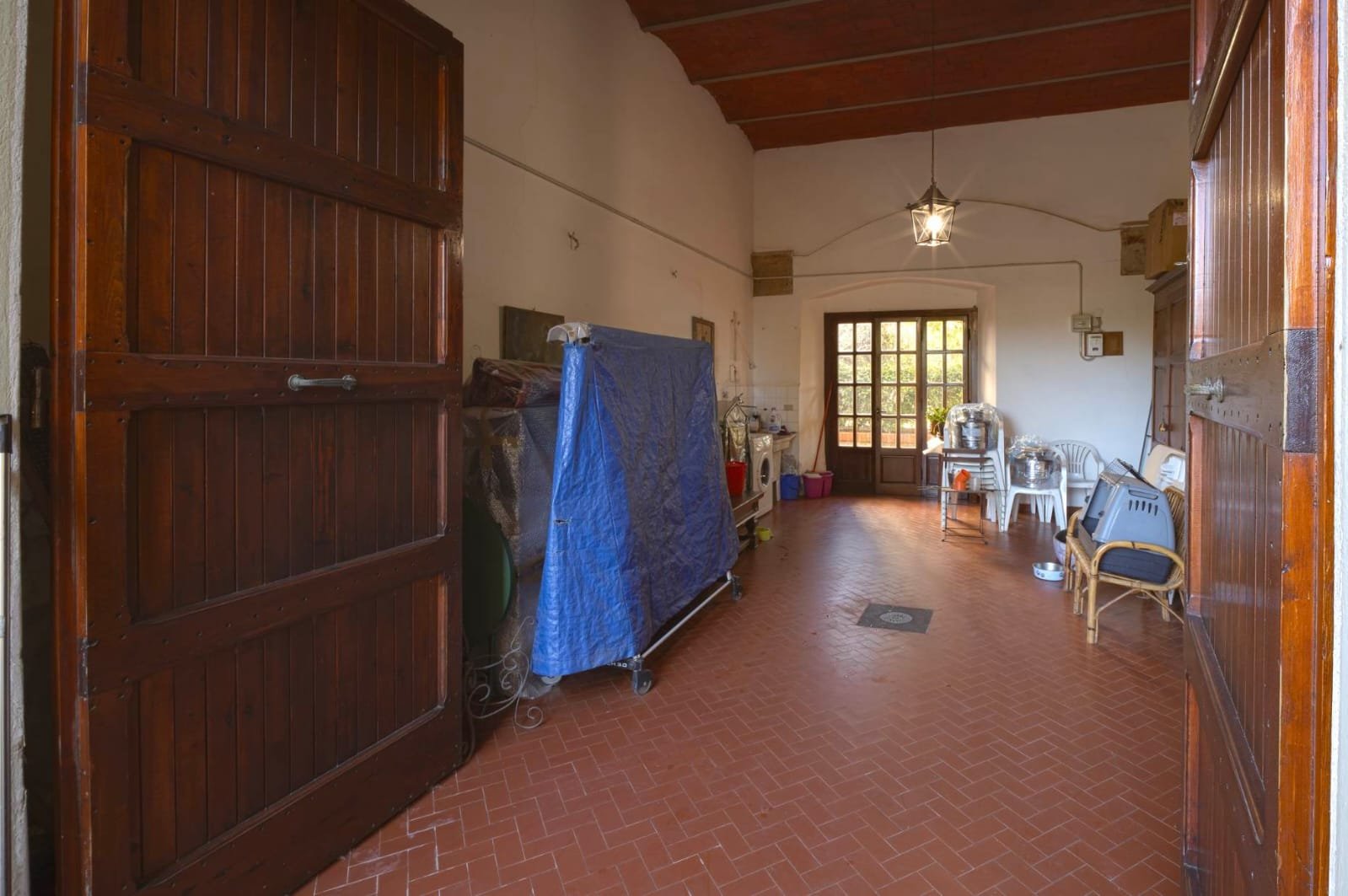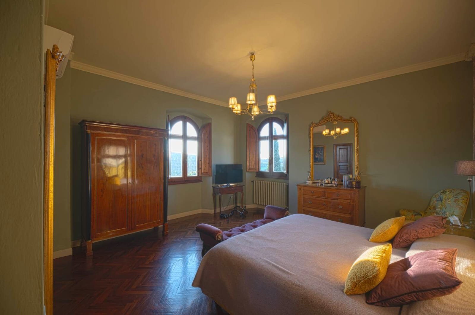 Gli interni conservano i materiali autentici: soffitti con travi a vista e cassettoni, pavimenti in cotto e dettagli in pietra serena. Le ampie camere e le zone giorno si aprono su balconi panoramici, mentre la doppia esposizione garantisce luce naturale in ogni ambiente.